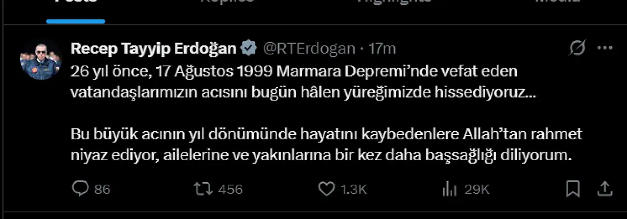 Sosyal medya hesabından açıklama yapan Cumhurbaşkanı Erdoğan, “26 yıl önce, 17 Ağustos 1999 Marmara Depremi’nde vefat eden vatandaşlarımızın acısını bugün hâlen yüreğimizde hissediyoruz. Bu büyük acının yıl dönümünde hayatını kaybedenlere Allah’tan rahmet niyaz ediyor, ailelerine ve yakınlarına bir kez daha başsağlığı diliyorum” ifadelerini kullandı.