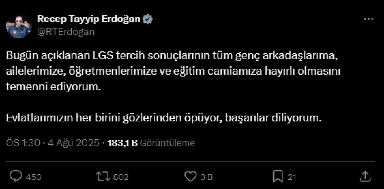 Cumhurbaşkanı ve AKP Genel Başkanı Recep Tayyip Erdoğan, sosyal medya hesabından bugün açıklanan LGS tercih sonuçlarıyla ilgili paylaşım yaparak, sonuçların tüm öğrencilere ve ailelerine hayırlı olması temennisinde bulundu.
