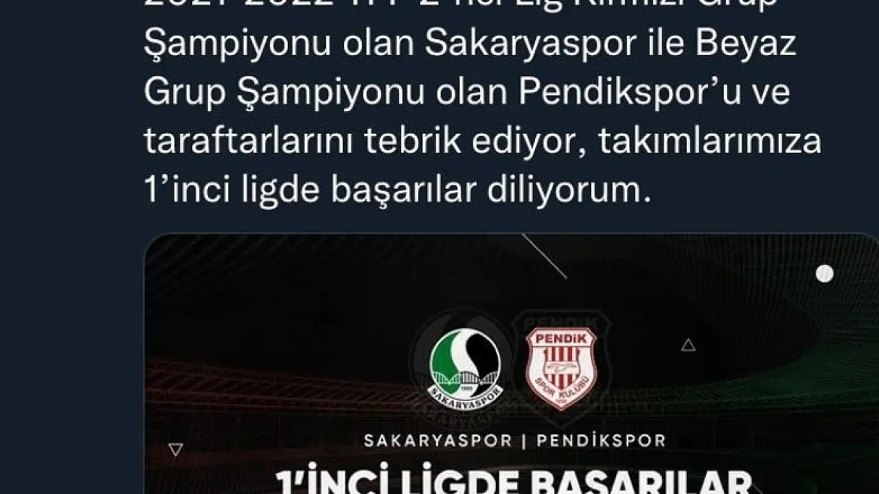 11 yıl aradan sonra 1. Lig hasretine son veren Sakaryaspor'a, Cumhurbaşkanı Recep Tayyip Erdoğan'dan tebrik geldi. Ligin 37. haftasında konuk ettiği Kahramanmaraşspor'u 1-0 yenerek kupayı kaldıran ve adeta çifte bayram yaşayan Sakaryaspor'u, Cumhurbaşkanı Recep Tayyip Erdoğan sosyal medya hesabından bir paylaşım yaparak tebrik etti. Cumhurbaşkanı Erdoğan yaptığı paylaşımda, "2021-2022 TFF 2. Lig Kırmızı Grup Şampiyonu olan Sakaryaspor ile Beyaz Grup şampiyonu olan Pendikspor'u ve taraftarlarını tebrik ediyor, takımlarımıza 1'inci ligde başarılar diliyorum" ifadelerine yer verdi.