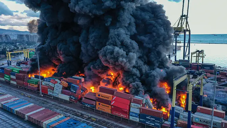 İskenderun Limanı'nda depremde devrilen konteynerlerde çıkan yangın devam ediyor.
