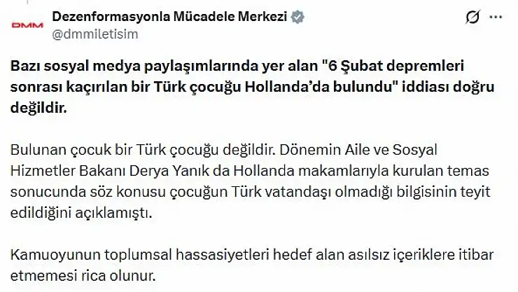 İletişim Başkanlığı Dezenformasyonla Mücadele Merkezi (DMM), bazı sosyal medya paylaşımlarında yer alan '6 Şubat depremleri sonrası kaçırılan bir Türk çocuğunun Hollanda'da bulunduğu' yönündeki iddiaların gerçeği yansıtmadığını açıkladı.