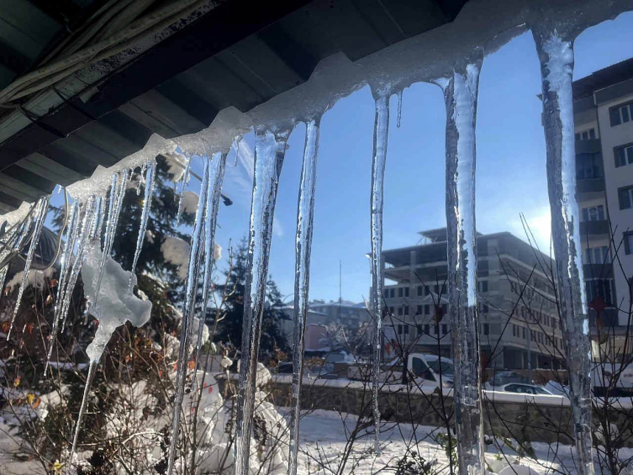Sarıkamış ilçesinde ev ve araçların camları buz tuttu, çatılarda buz sarkıtları oluştu.