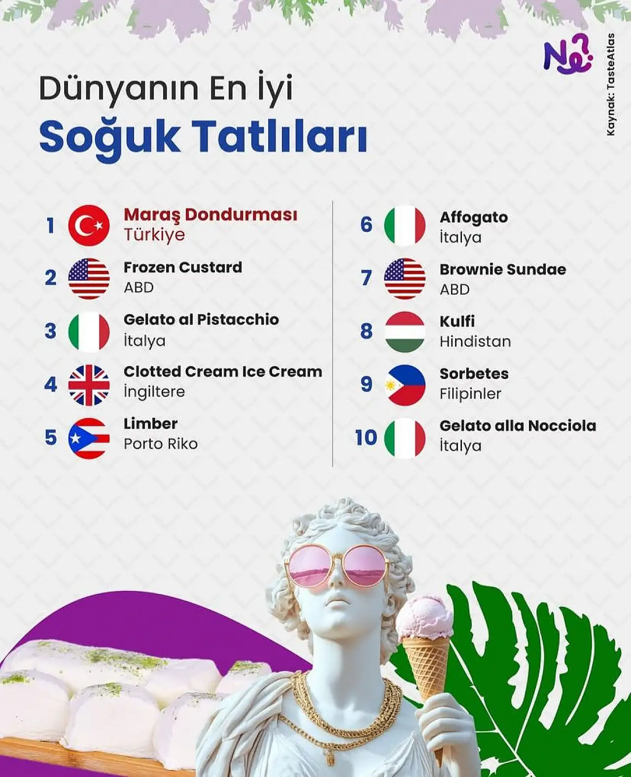 TasteAtlas'ın hazırladığı 'Dünyanın En İyi Soğuk Tatlıları' listesinde Türkiye'nin meşhur Maraş dondurması birinci sırada yer aldı. İtalya, ABD ve İngiltere gibi ülkelerin tatlılarını geride bırakan Maraş dondurması, dünya mutfakları arasında damakları fethetti.