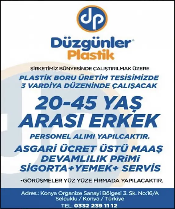 Haberler Konya Eleman İlanları Düzgünler Pilastik 20-45 Yaş arası Erkek Eleman Alımı yapacak. Düzgünler Pilastik 20-45 Yaş arası Erkek Eleman Alımı yapacak. 3 Vardiyalı Personel Alımı Yapılacaktır.Detaylar ilan görselinde. PAYLAŞ 16.10.2025 13:11 Güncelleme: 16.10.2025 13:11 TAKİP ET 1 1 PAYLAŞ Görsel - 1 : Düzgünler Pilastik 20-45 Yaş arası Erkek Eleman Alımı yapacak. Hakimiyet Gazetesi - Hakimiyet Haber - Bizi Sosyal Medyada Takip Edin! Facebook X.com Instagram