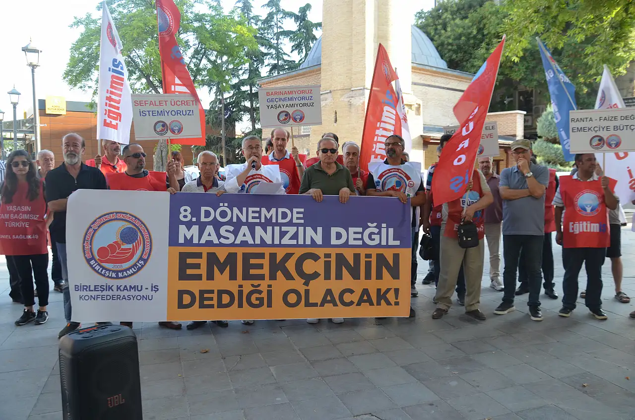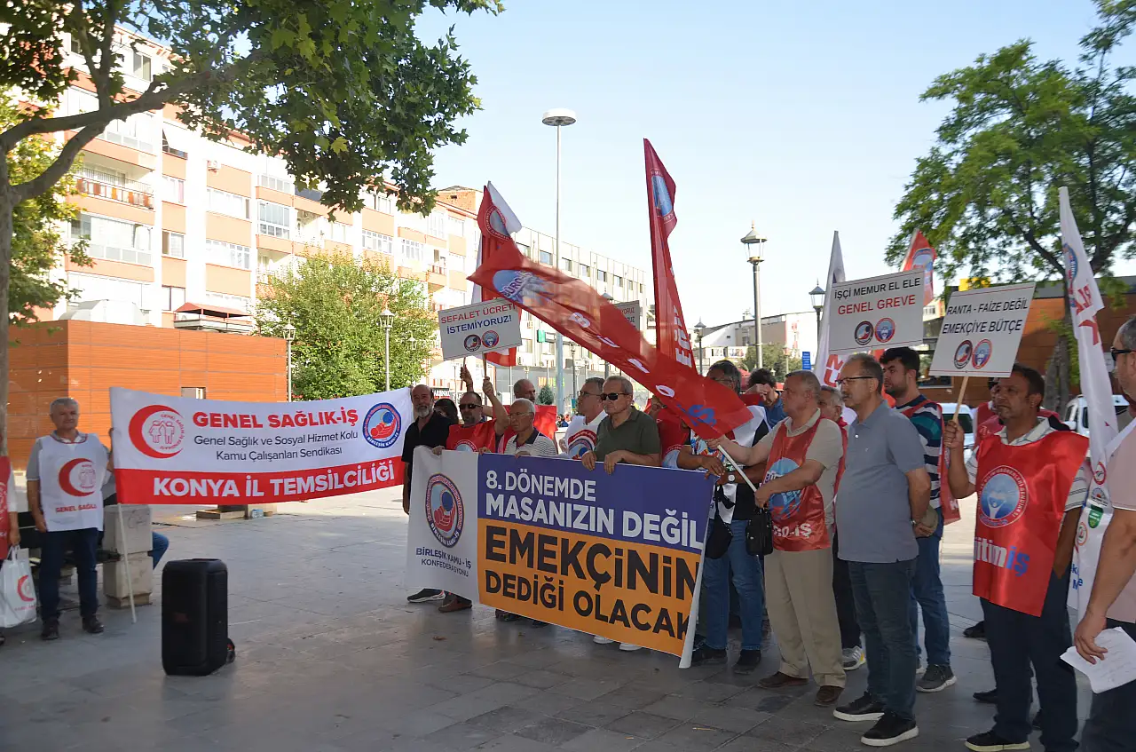 Eğitim-İş Konya Şube Başkanı ve Birleşik Kamu-İş Konya İl Temsilcisi Bahattin Ertuğrul düzenlediği basın açıklamasında, '8. Dönem Toplu Sözleşme görüşmelerinde teklif edilen zam oranını protesto ediyoruz. Talebimiz, günümüz şartlarında geçinebileceğimiz bir ücrettir' dedi.