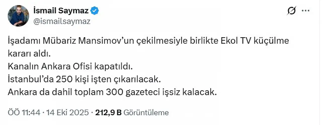Mübariz Mansimov'un medyadan çekilmesi sonrası Ekol TV küçülme kararı aldı. Gazeteci İsmail Saymaz'ın sosyal medya hesabından yaptığı paylaşıma göre, toplamda 300 gazetecinin işten çıkarılması bekleniyor.