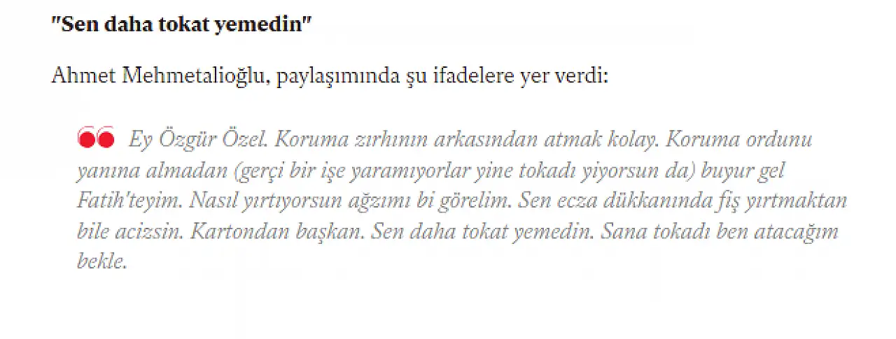 Mehmetalioğlu, sosyal medyada yaptığı paylaşımda "Sana tokadı ben atacağım bekle" ifadesini kullandı. Diyanet'in hakkında soruşturma başlattığını açıkladığı ancak Kocaeli’ye vaiz olarak atanan Mehmetalioğlu'na Volkan Konak'a yönelik ifadeleri sebebiyle CHP Genel Başkanı Özgür Özel de mitinglerde tepki göstermişti. İşte Mehmetalioğlunun, oğlu tarafından yönetilen sosyal medya hesabından CHP Genel Başkanı Özel'e yönelik yaptığı o paylaşım