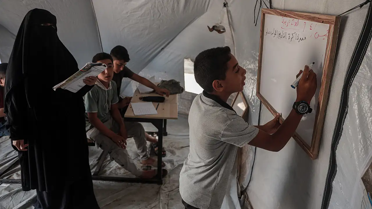 İsrail saldırıları altındaki Gazze Şeridi'nde Arapça öğretmeni Naga Ebu Rahme, yeni eğitim öğretim yılının başlamasıyla öğrencilerin eğitimlerinden mahrum kalmamaları için Deyr el-Belah'ta kentinde eğitim çadırı kurdu.
