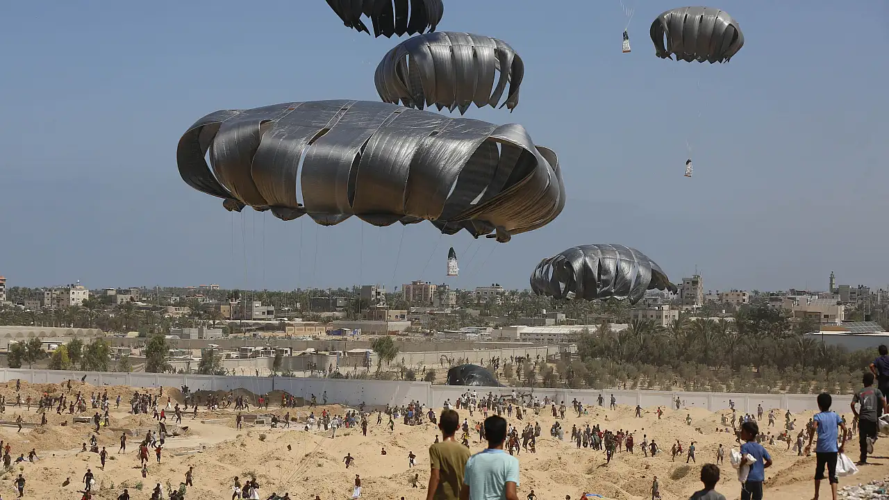 Filistinlilerin, yardım almak için yoğunluk oluşturduğu bölgede uçaklar, Gazze Şeridi'nin orta kesiminde yer alan Deyr Belah kentine paraşütle havadan yardım indirdi.