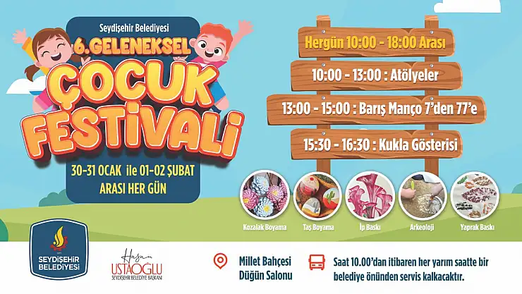 Millet Bahçesinde düzenlenecek olan, yarışmaların, oyunların, çeşitli etkinliklerin ve atölye çalışmalarının yer aldığı festival 4 gün sürecek. 30 Ocak- 2 Şubat tarihleri arasında düzenlenecek festivalde çocuklar, özel olarak hazırlanmış atölyelerde hem eğlenip hem de bilgi sahibi olacak. Geleneksel olarak her yıl sömestr tatilinde gerçekleştirilen festivale tüm çocukları davet eden Seydişehir Belediye Başkanı Hasan Ustaoğlu, “çocukların tatillerini eğlenceli geçirmeleri için bu yıl farklı konseptlerde düzenleyeceğimiz festivalimize tüm çocuklarımızı davet ediyorum” dedi.