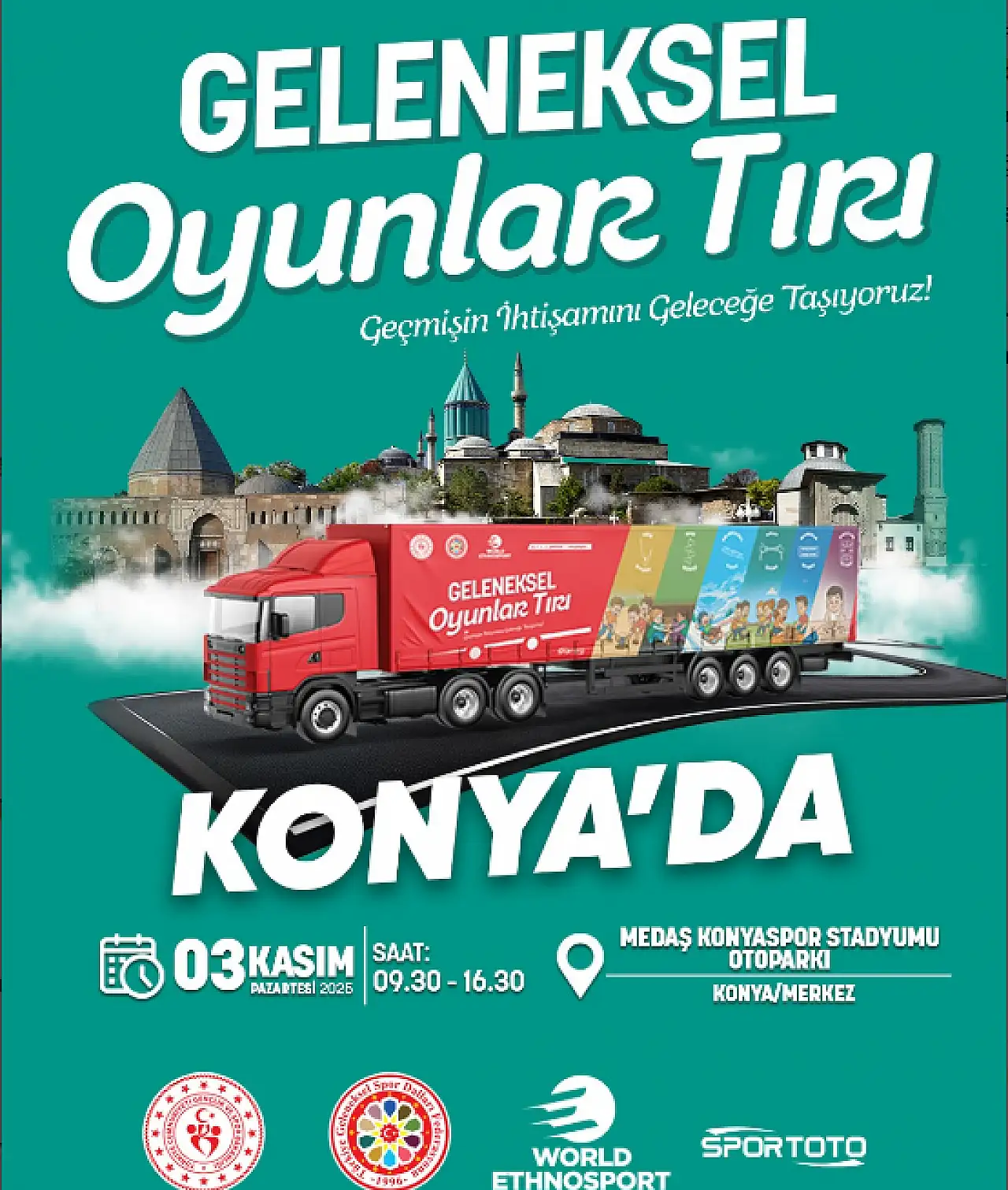 Türkiye Geleneksel Spor Dalları Federasyonu'nun çocuklara, gençlere ve yetişkinlere unutulmaz anlar yaşatan 'Geleneksel Oyunlar TIR'ı' yeniden yollarda! Anadolu'yu karış karış gezen bu neşe dolu TIR, bu kez Konya'ya uğrayarak şehrin dört bir yanına mutluluk taşıyacak.