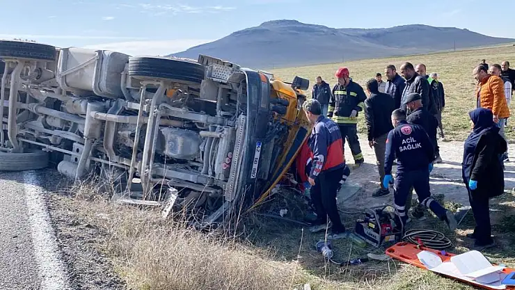 Konya Kulu'da kum yüklü hafriyat kamyonunun devrilmesi sonucu meydana gelen trafik kazasında, kamyon sürücüsü yaralandı.