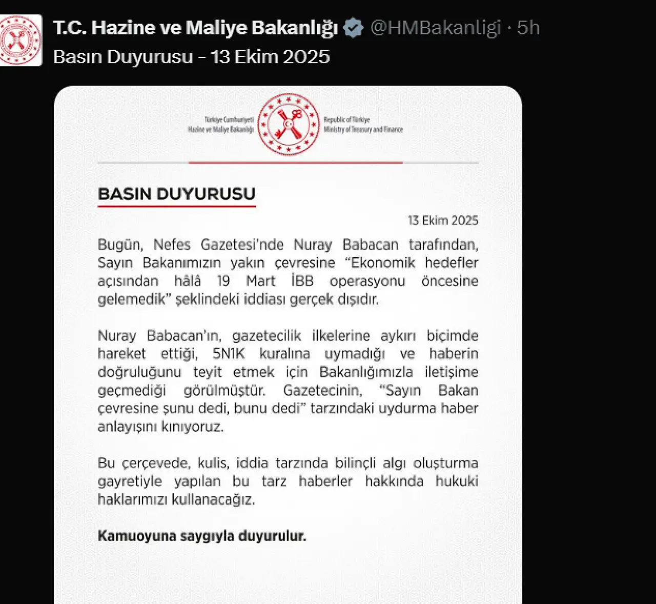 Bakanlık, söz konusu iddiaların tamamen asılsız olduğunu belirterek şunları aktardı: “Nefes Gazetesi'nde Nuray Babacan tarafından, Sayın Bakanımızın yakın çevresine ‘Ekonomik hedefler açısından hâlâ 19 Mart İBB operasyonu öncesine gelemedik’ şeklindeki iddiası gerçek dışıdır. Gazetecinin, haberin doğruluğunu teyit etmek için Bakanlığımızla iletişime geçmediği görülmüştür.”