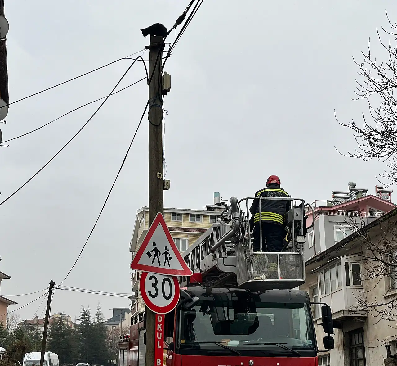 Konya'nın Beyşehir ilçesi Hacıakif Mahallesi'nde bir sokakta kedinin direkte uzun süre kaldığını ve inemediğini çıkardığı sesten fark eden vatandaşlar durumu itfaiyeye bildirdi.