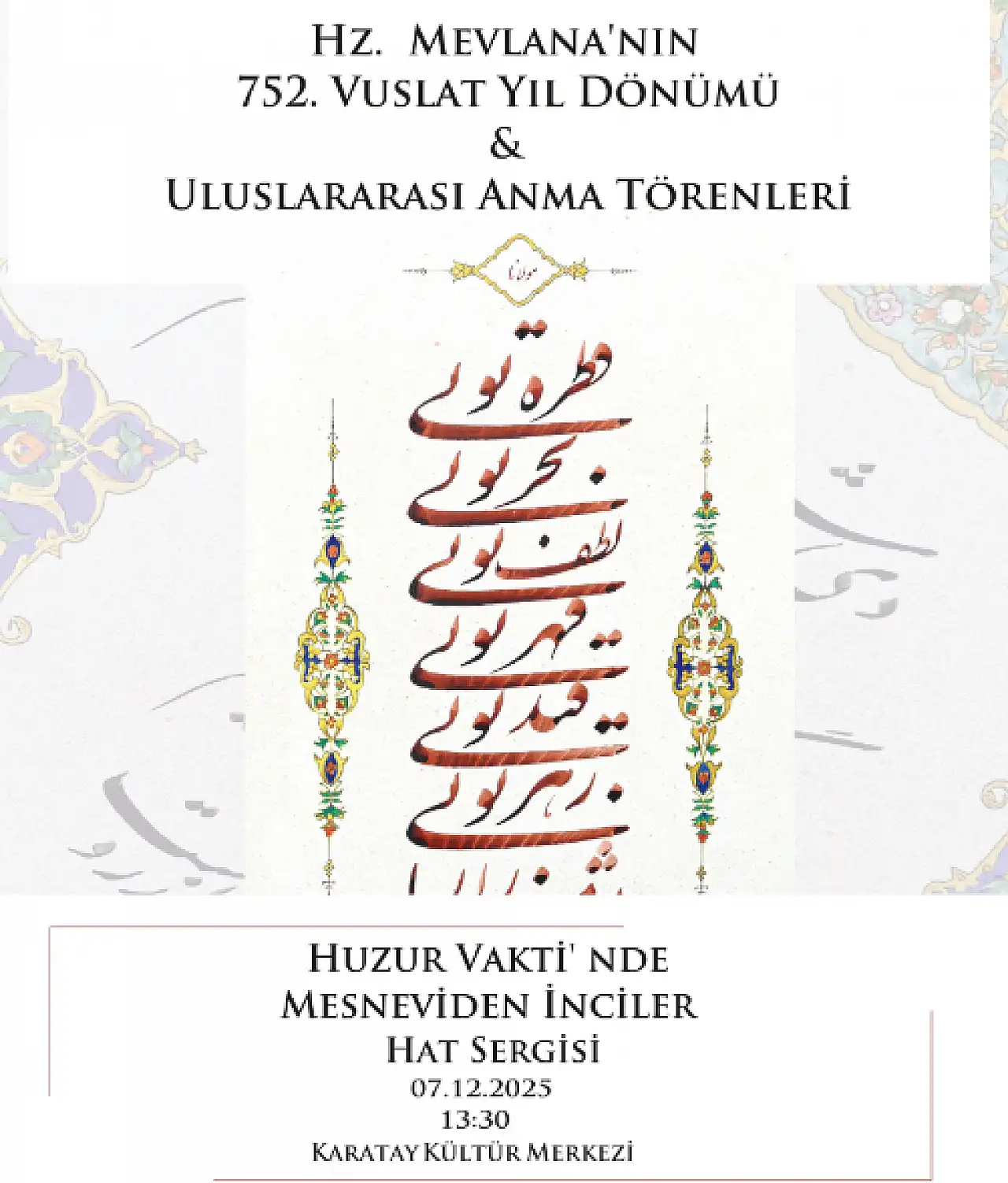 Mevlana'nın 752'nci Vuslat Yıl Dönümü ve 2025 Türkiye–İran Kültür Yılı etkinlikleri kapsamında hazırlanan 'Huzur Vakti'nde Mesneviden İnciler Hat Sergisi', 7 Aralık Pazar günü Karatay Kültür Merkezi'nde sanatseverlerle buluşmaya hazırlanıyor.