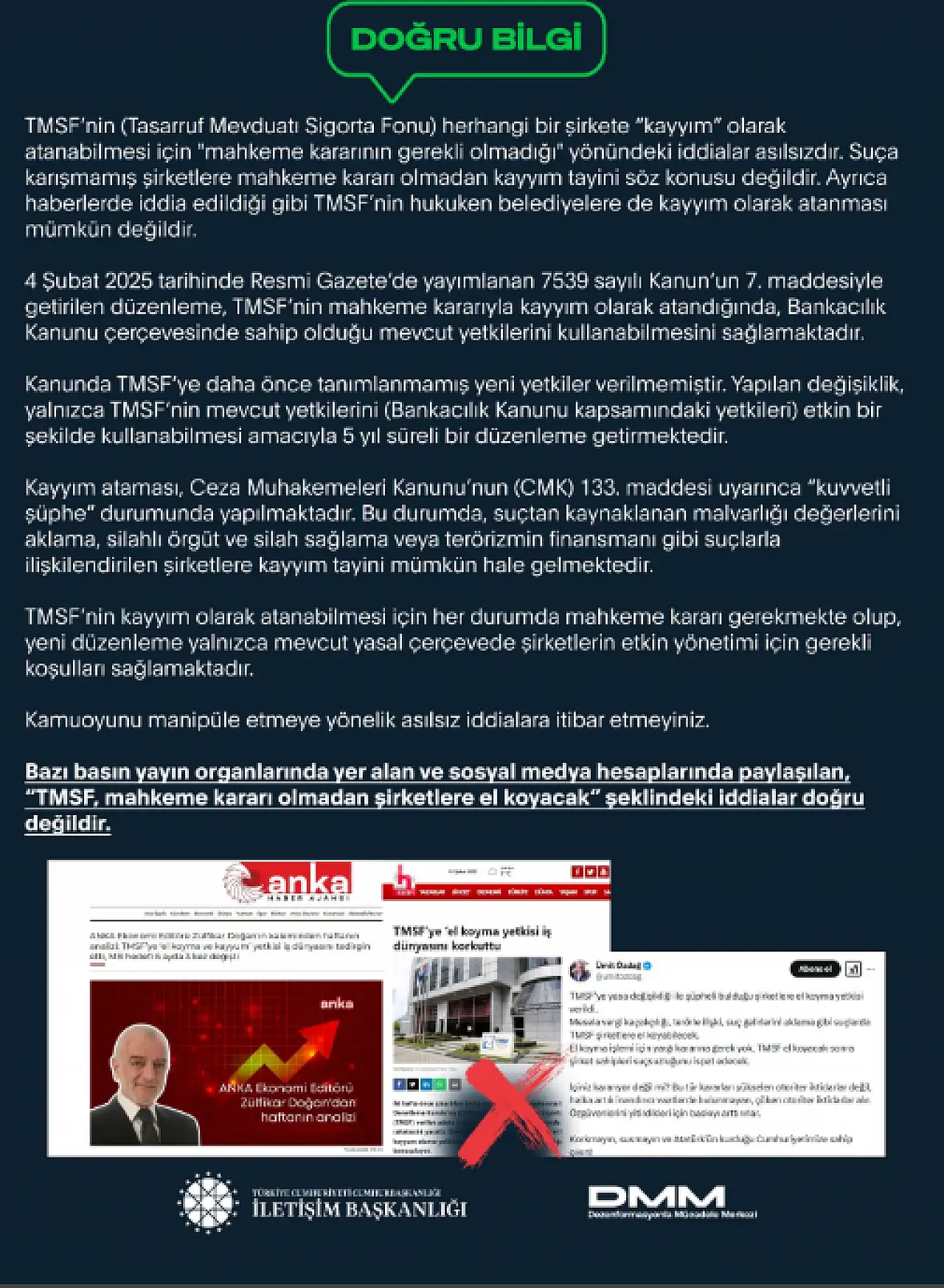 Yapılan açıklamda TMSF’nin (Tasarruf Mevduatı Sigorta Fonu) herhangi bir şirkete “kayyım” olarak atanabilmesi için "mahkeme kararının gerekli olmadığı" yönündeki iddialar asılsızdır. Suça karışmamış şirketlere mahkeme kararı olmadan kayyım tayini söz konusu değildir. Ayrıca haberlerde iddia edildiği gibi TMSF’nin hukuken belediyelere de kayyım olarak atanması mümkün değildir. 4 Şubat 2025 tarihinde Resmî Gazete’de yayımlanan 7539 sayılı Kanun’un 7. maddesiyle getirilen düzenleme, TMSF’nin mahkeme kararıyla kayyım olarak atandığında, Bankacılık Kanunu çerçevesinde sahip olduğu mevcut yetkilerini kullanabilmesini sağlamaktadır. Kanunda TMSF’ye daha önce tanımlanmamış yeni yetkiler verilmemiştir. Yapılan değişiklik, yalnızca TMSF’nin mevcut yetkilerini (Bankacılık Kanunu kapsamındaki yetkileri) etkin bir şekilde kullanabilmesi amacıyla 5 yıl süreli bir düzenleme getirmektedir.