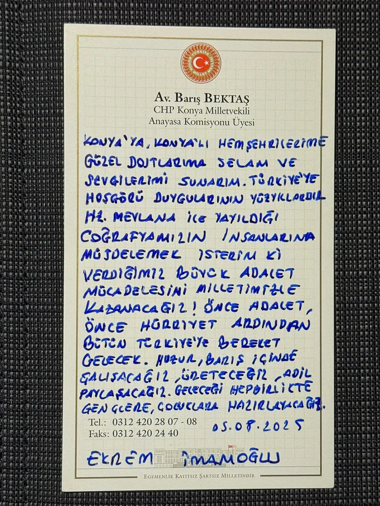 Notta İmamoğlu, Konya halkına selam ve sevgilerini göndererek şu mesajları verdi: “Türkiye’ye hoşgörü duygularının yayıldığı Hz. Mevlana ile özdeşleşen Konya’mızın güzel insanlarına selam olsun. Mücadelemiz, önce adalet, sonra hürriyet ve ardından tüm Türkiye’ye gelecek olan bereket içindir. Huzur, barış ve adalet dolu bir gelecek için çalışacağız.”