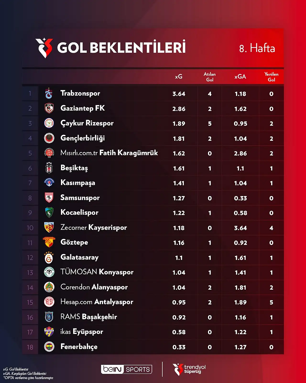 beIN Sports’un hazırladığı 8. hafta gol beklentisi tablosu, Konyaspor adına farklı bir gerçeği ortaya koydu. Takım bu hafta itibarıyla sadece 1,04 gol beklentisi yakalayabildi. Bu değer, ligin alt sıralarında yer alan takımlarla benzer bir seviyede. Konyaspor bu süreçte yalnızca 1 gol atarken, savunmada da 1,41 gol yeme beklentisi ile kırılgan bir görüntü sergiledi.