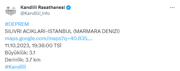 Merkez üssü İstanbul'un Silivri ilçesi açıkları olan 3.1 şiddetinde bir deprem meydana geldi. Depreme ilişkin Kandilli Rasathanesi ve AFAD tarafından yayımlanan verilere göre şiddetli deprem saat 19:36'da, yerin 3.7 kilometre derinliğinde meydana geldi.