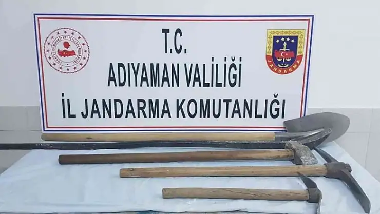 Adıyaman İl Jandarma Komutanlığa gelen ihbar üzerine harekete geçen ekipler Gölbaşı Savran köyünde izinsiz kazı yapan M.G., A.D., A.G ve Ö.G. isimli şahıslar kazı yaptıkları alanda suç üstü yakaladı. Kazı alanında 2 adet kazma, 1 adet demir murç, 1 adet balyoz, 1 adet kürek ele geçirildi.