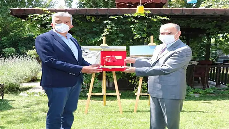 Konya Valisi Vahdettin Özkan, İl Jandarma Komutanı Tuğg. Şakir Uslu ve İl Emniyet Müdürü Engin Dinç'in katılımıyla Konya Ticaret Borsası Başkanı Hüseyin Çevik ve yönetimine Yunak'ta yapılan jandarma binasına katkılarından dolayı plaket takdiminde bulundu.