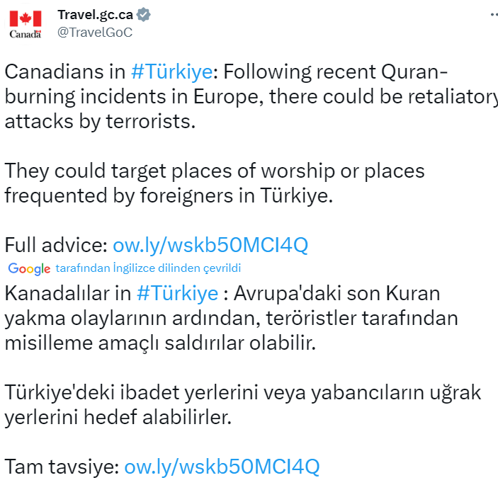 Kanada Konsolosluğundan yapılan açıklamaya göre, “ Kanadalılar için Türkiye güncellemesi: Türkiye’de teröristler tarafından yakın bir misilleme saldırısı tehdidi var. Kanadalıların Türkiye