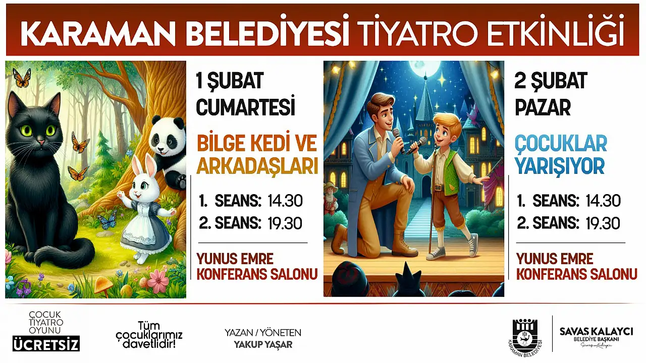 Karaman Belediyesi, her yıl olduğu gibi bu yarıyıl tatilinde de çocukları unutmadı. Çocukların keyifle izleyeceği iki farklı tiyatro oyunu, 1 ve 2 Şubat tarihlerinde Yunus Emre Konferans Salonu'nda sahnelenecek.
