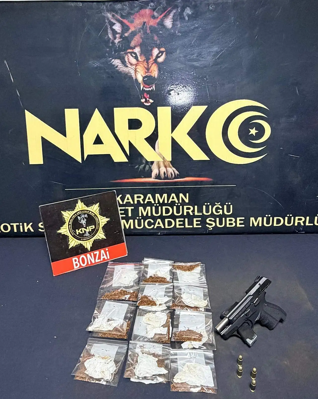 Yapılan asayiş ve narkotik uygulamalarında 2 adet ruhsatsız tabanca, 2 adet ruhsatsız tüfek, 8 adet tabanca fişeği, 16 adet kesici ve delici alet, 53 gram bonzai, 2 gram metamfetamin ve 120 litre etil alkol ele geçirildi.