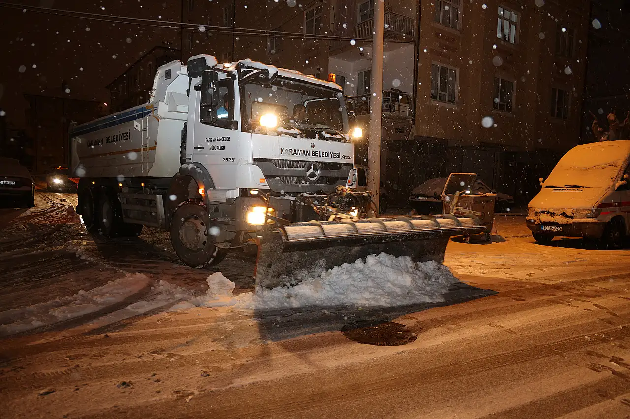 Karaman'da etkili olan kar yağışının ardından Karaman Belediyesi, ulaşımda aksama yaşanmaması ve günlük yaşamın olumsuz etkilenmemesi amacıyla tüm ekip ve araçlarıyla sahaya çıktı.