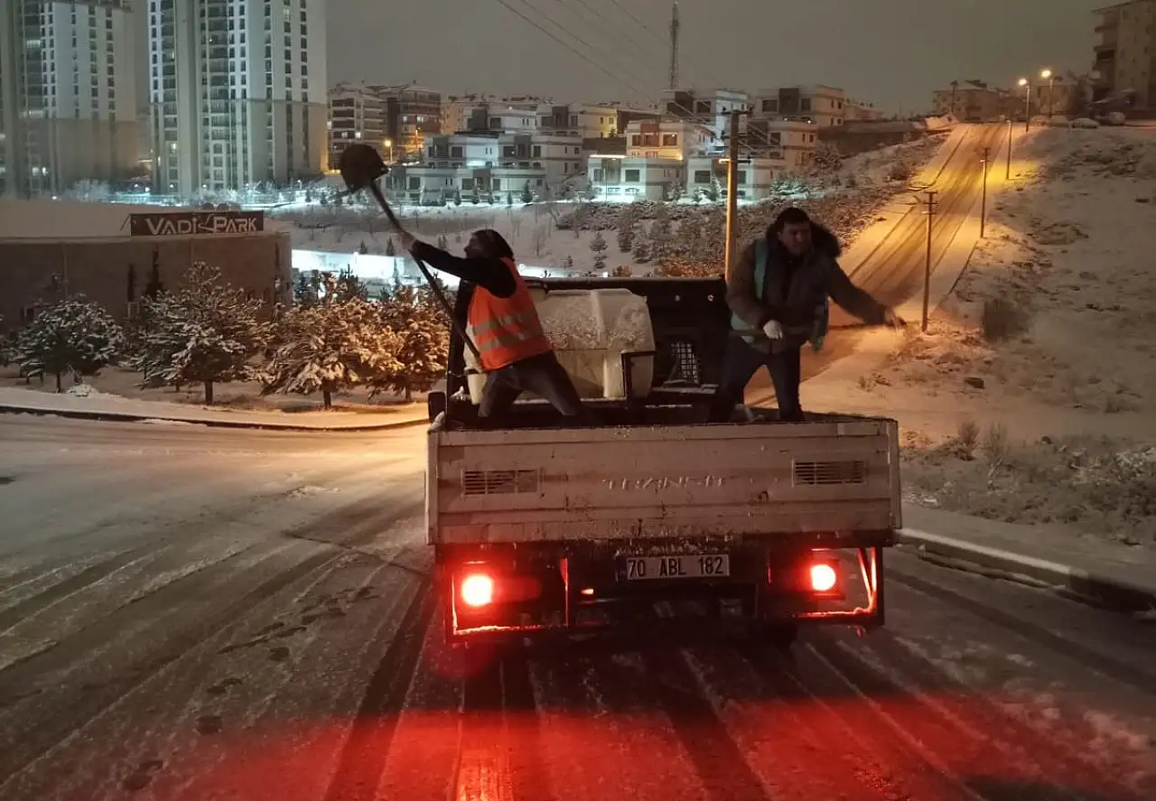 Karaman Belediyesi’nden yapılan açıklamada, ekiplerin 24 saat esasına göre görev başında olduğu belirtilerek, kar yağışının sürmesi halinde çalışmaların kesintisiz devam edeceği ifade edildi. Belediye, vatandaşların günlük yaşamını sorunsuz şekilde sürdürebilmesi için gerekli tüm önlemlerin alındığını vurguladı.