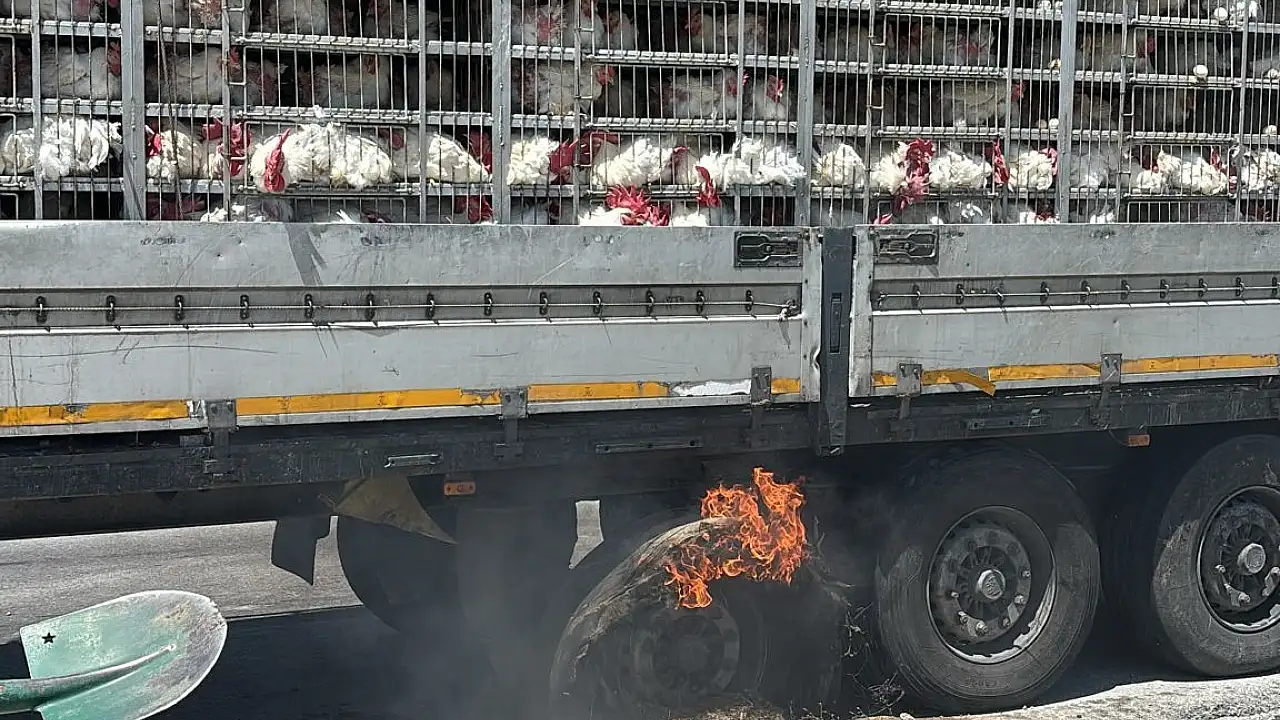 Konya'nın Karapınar ilçesinde canlı tavuk dolu tırın dorse lastiklerinde çıkan yangın paniğe neden oldu.