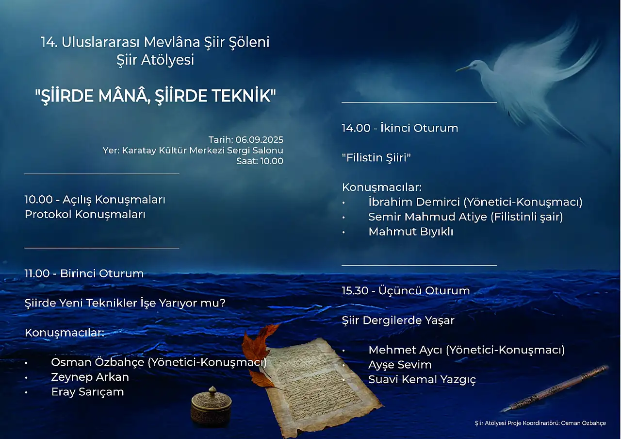 Karatay Belediyesi ve Türkiye Yazarlar Birliği Konya Şubesi'nin birlikte organize ettiği, Kültür ve Turizm Bakanlığı'nın da destek verdiği 'Uluslararası 14. Mevlânâ Şiir Şöleni ve Şiir Atölyesi', 6 Eylül 2025 Cumartesi akşamı düzenlenecek.