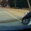 Görüntüde elleri cebinde giden bisikletlinin dengesini kaybederek yola savrulması, otomobil sürücüsünün hızlı manevrası ile yanından geçmesi, daha sonra bisikletlinin toparlanarak kalkması ve caddeden gelen araçlar görülüyor.