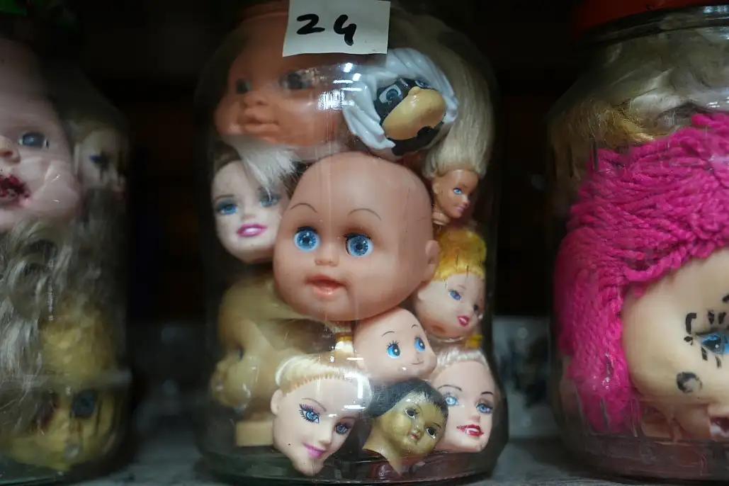 Kocaeli'de bir antikacı, yalnız yaşayan bir koleksiyonerin bit pazarlarından çöplere kadar her yerden 50 yıl boyunca topladığı 5 bin oyuncak bebek kafasını kavanoz ve akvaryumlarda sergiliyor görenlerin kimisi hayran kalırken kimisi ürperiyor.