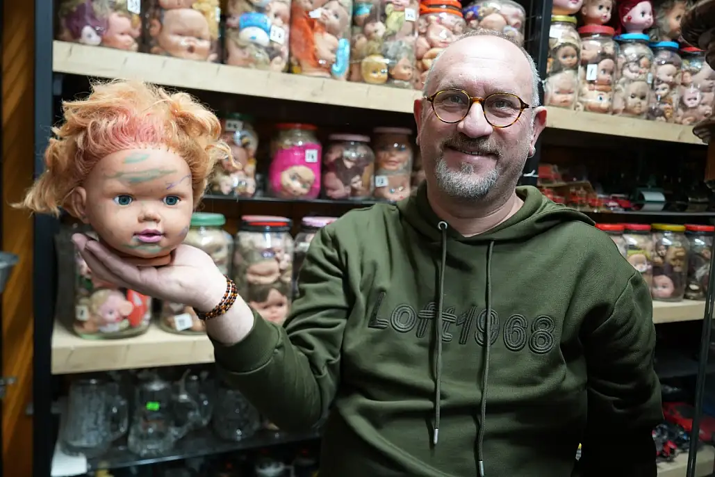 Kocaeli'de bir antikacı, yalnız yaşayan bir koleksiyonerin bit pazarlarından çöplere kadar her yerden 50 yıl boyunca topladığı 5 bin oyuncak bebek kafasını kavanoz ve akvaryumlarda sergiliyor görenlerin kimisi hayran kalırken kimisi ürperiyor.