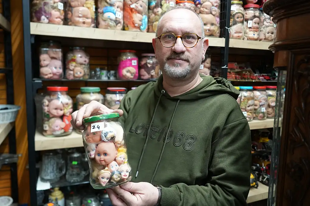 Kocaeli'de bir antikacı, yalnız yaşayan bir koleksiyonerin bit pazarlarından çöplere kadar her yerden 50 yıl boyunca topladığı 5 bin oyuncak bebek kafasını kavanoz ve akvaryumlarda sergiliyor görenlerin kimisi hayran kalırken kimisi ürperiyor.