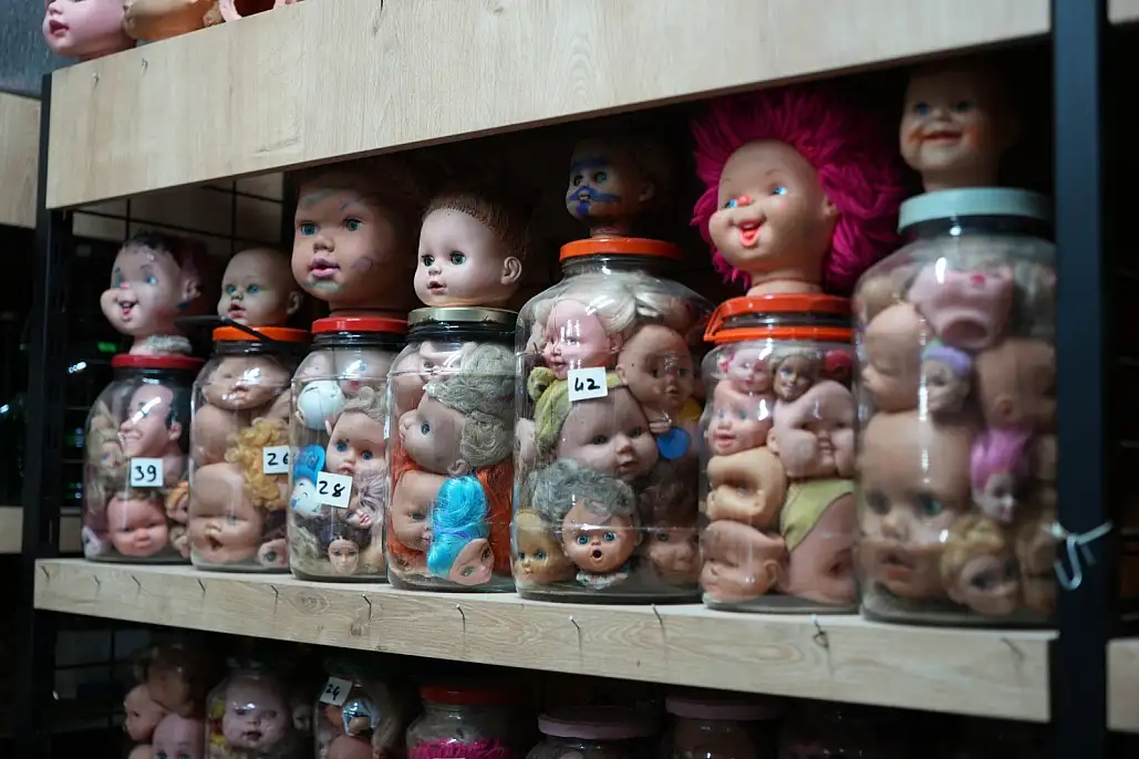 Kocaeli'de bir antikacı, yalnız yaşayan bir koleksiyonerin bit pazarlarından çöplere kadar her yerden 50 yıl boyunca topladığı 5 bin oyuncak bebek kafasını kavanoz ve akvaryumlarda sergiliyor görenlerin kimisi hayran kalırken kimisi ürperiyor.