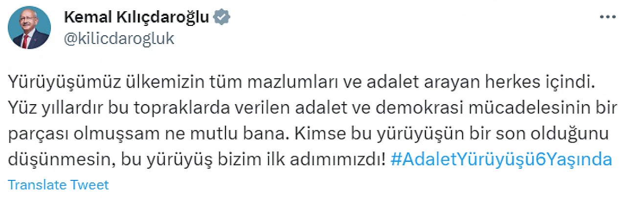 Cumhuriyet Halk Partisi Genel Başkanı Kemal Kılıçdaroğlu, sosyal medya hesabından adalet yürüyüşünün altıncı yılını kutladı. Kılıçdaroğlu, 'Kimse bu yürüyüşün bir son olduğunu düşünmesin, bu yürüyüş bizim ilk adımımızdı!' dedi.