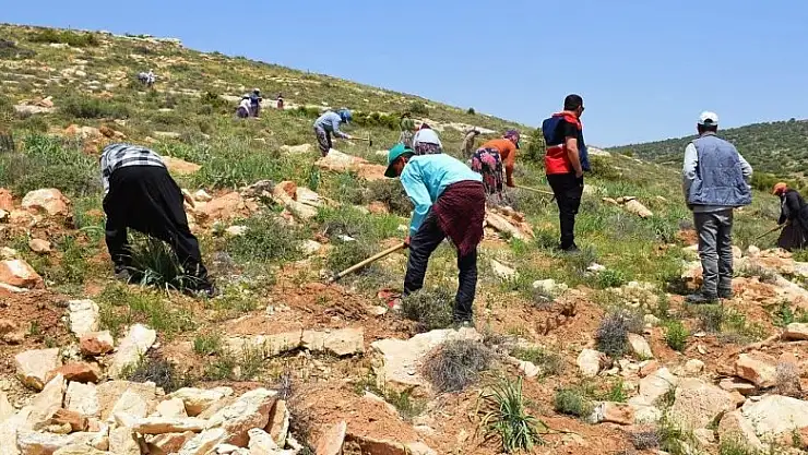 Kilis Orman İşletme Müdürlüğü tarafından oluşturulan bal ormanında ot alma ve çapalama çalışmaları sürüyor.