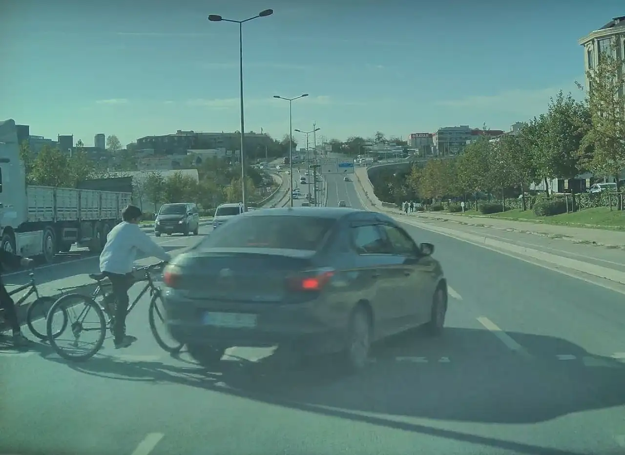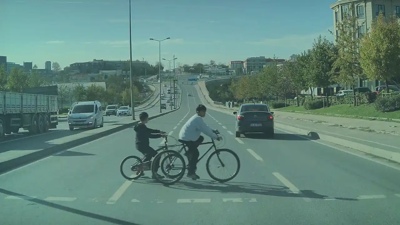 Hemen arkasından gelen başka bir araç sürücüsü de aynı şekilde kırmızı ışıkta geçmeye çalıştı. O esnada, kendilerine yeşil ışığın yanmasıyla yolun karşısına geçmeye çalışan bisikletli iki çocuk, hızla gelen otomobilin altında kalmaktan son anda kurtuldu.