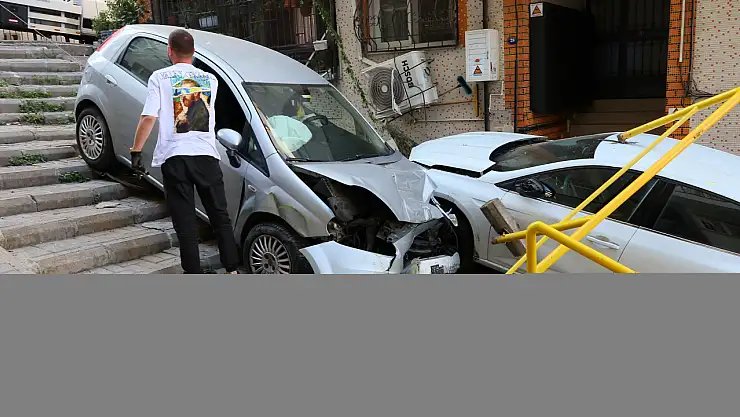 Kontrolden çıkan otomobil, park halindeki otomobile çarptı. Çarpmanın etkisiyle otomobiller merdivenlere düştü.
