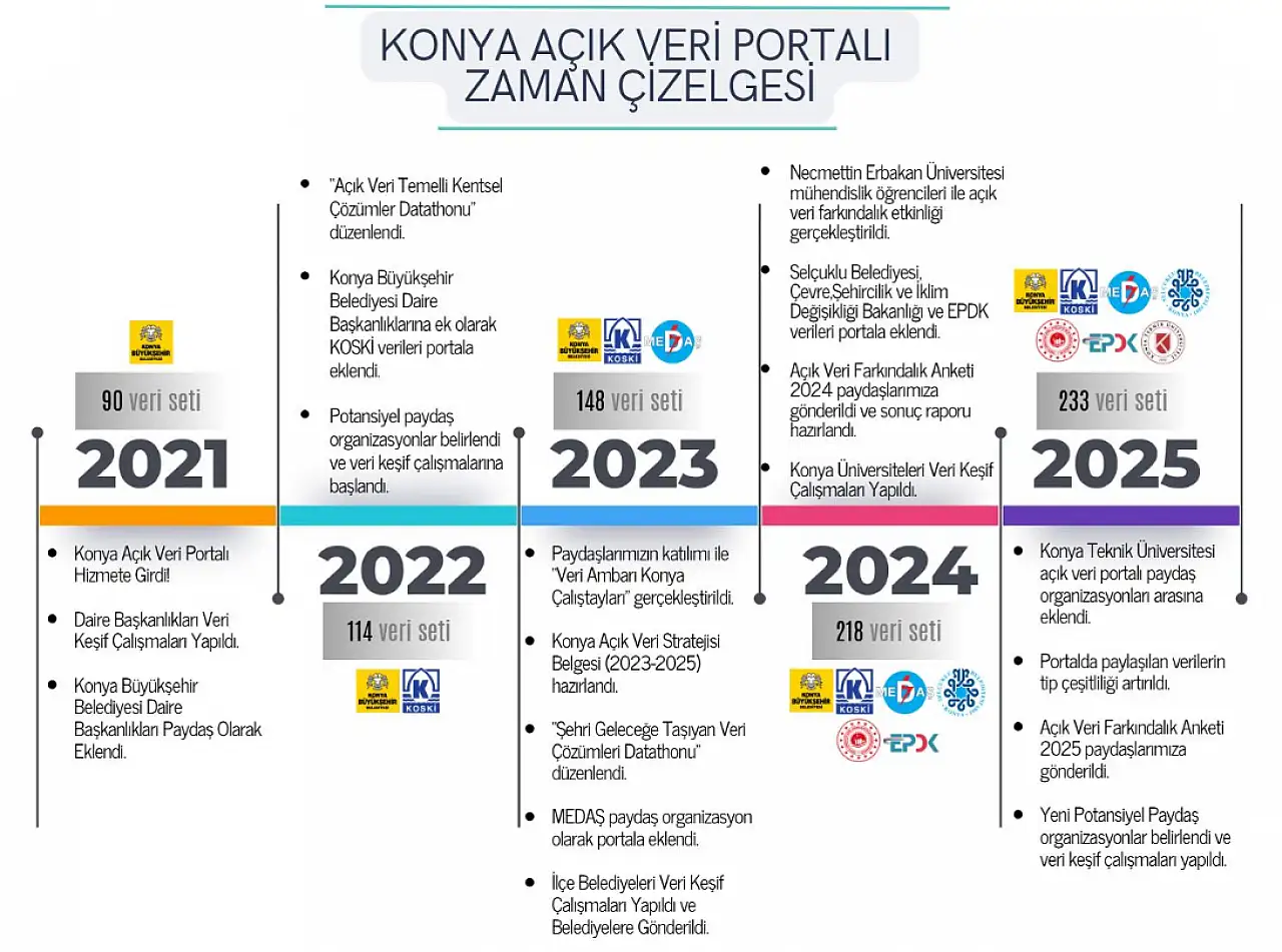 Bugün itibarıyla Konya Açık Veri Portalı, 20 paydaş kurumun katkısıyla 230’un üzerinde veri setini kullanıcıların erişimine sunuyor. Çevre, Şehircilik ve İklim Değişikliği Bakanlığı, Konya Büyükşehir Belediyesi’nin daire başkanlıkları, KOSKİ, Selçuklu Belediyesi, MEDAŞ, EPDK ve Konya Teknik Üniversitesi gibi önemli kurumların ekosisteme dahil olması, portalın kurumsal gücünü artırıyor.