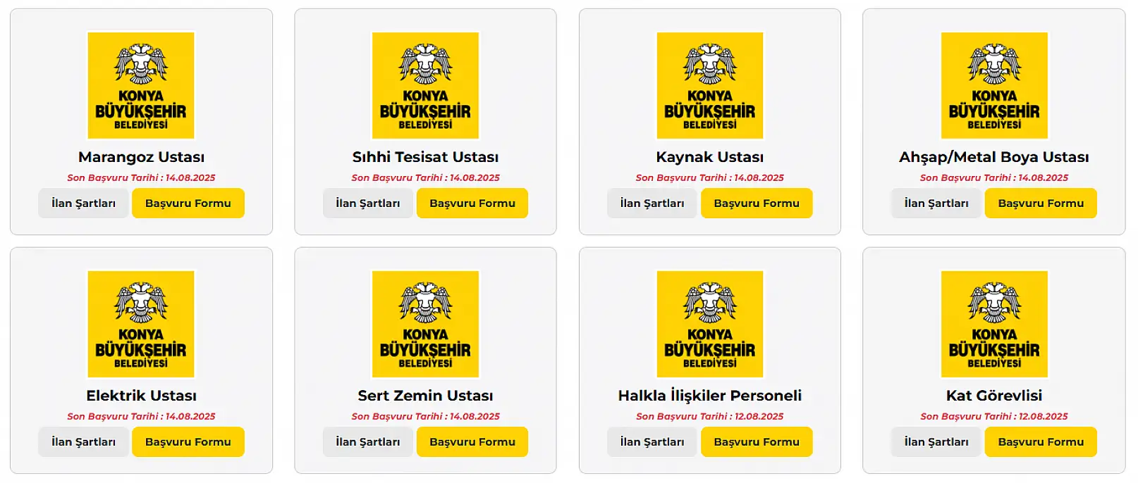Konya Büyükşehir Belediyesi marangozdan otobüs şoförüne, bahçıvandan elektrik ustasına kadar onlarca meslek dalında yüzlerce kadro açtı. Son başvuru tarihi hızla yaklaşıyor…