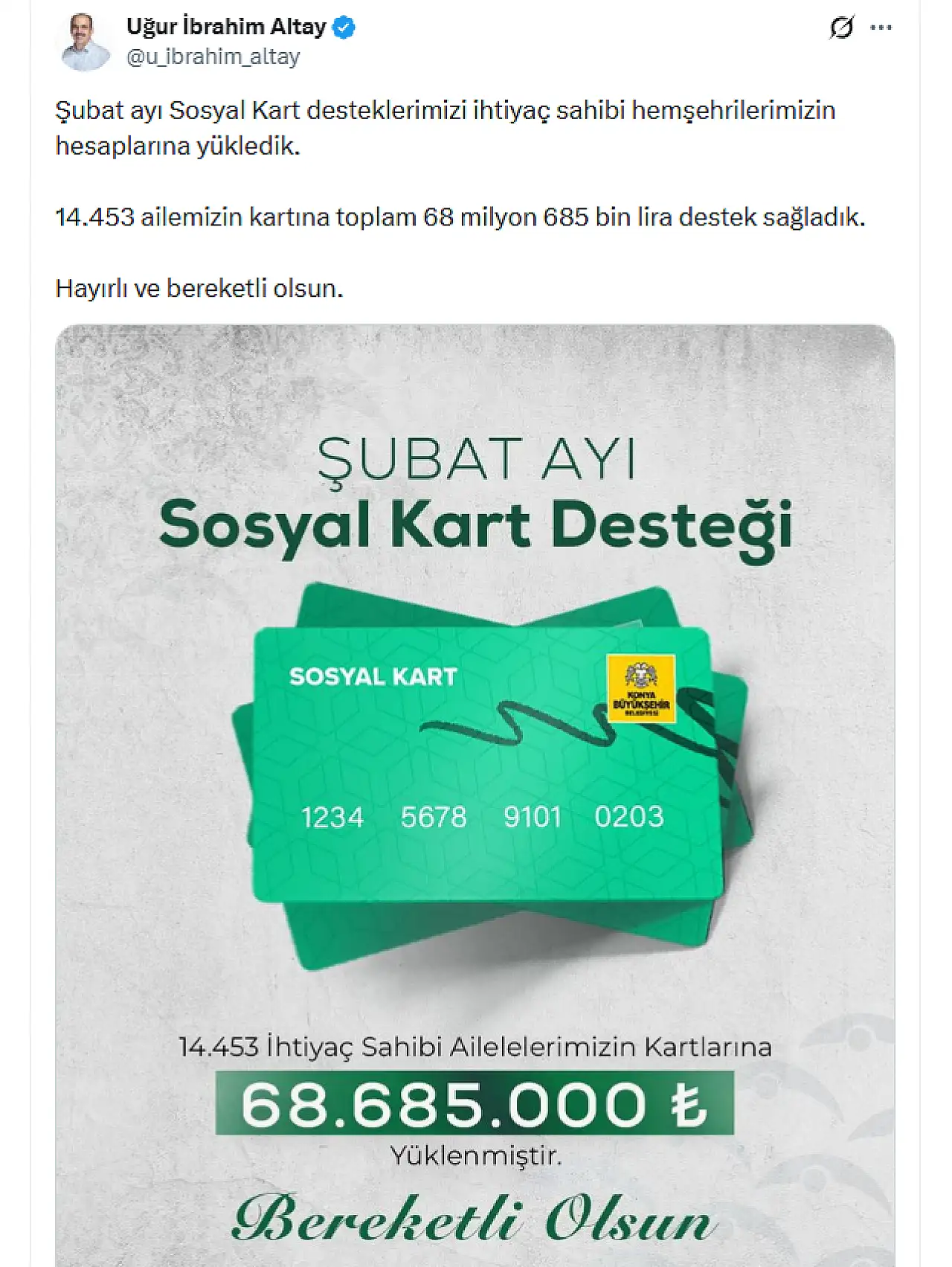 Başkan Altay, sosyal medya üzerinden yaptığı duyuruda, “Şubat ayı Sosyal Kart desteklerimizi ihtiyaç sahibi hemşehrilerimizin hesaplarına yükledik. 14.453 ailemizin kartına toplam 68 milyon 685 bin lira destek sağladık. Hayırlı ve bereketli olsun.” ifadelerine yer verdi.