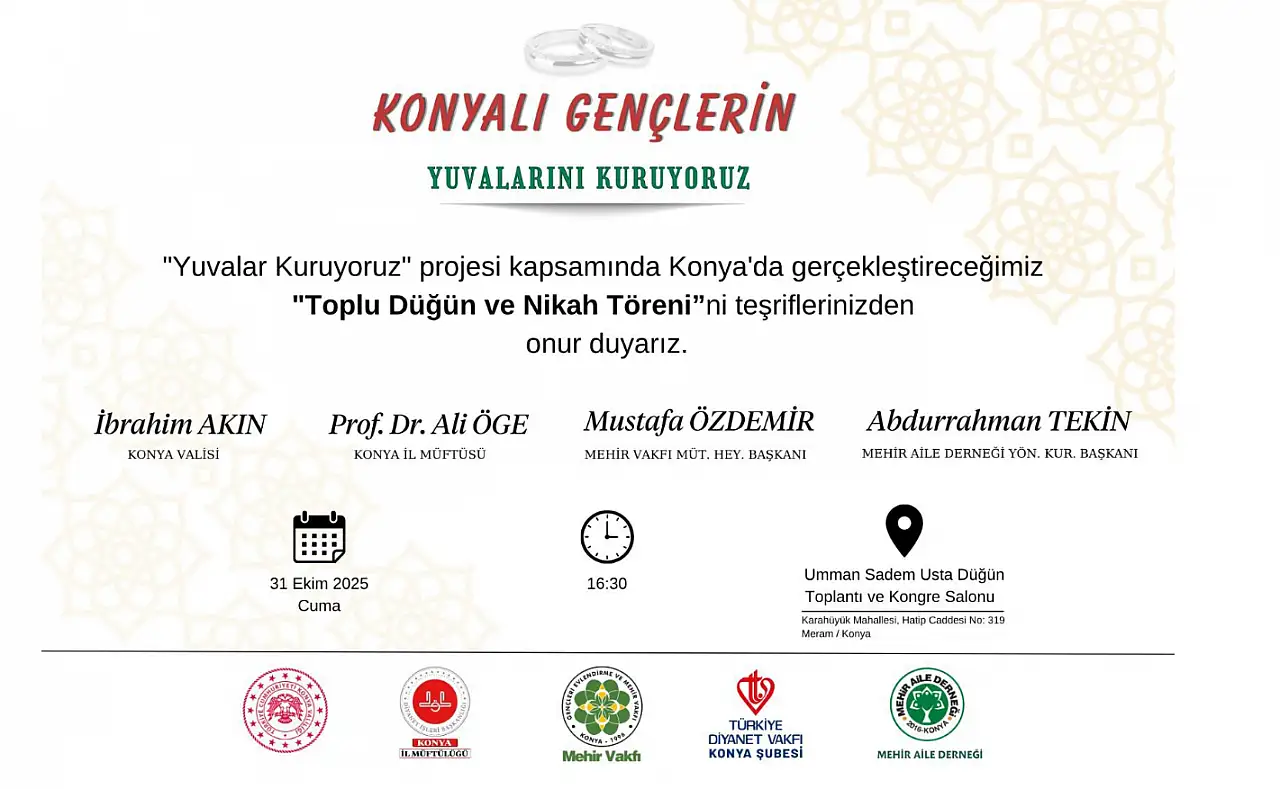 Cumhurbaşkanı Recep Tayyip Erdoğan tarafından 2025’in “Aile Yılı” ilan edilmesiyle uyumlu olarak düzenlenen bu anlamlı etkinlik, aile kurumunun güçlendirilmesi ve gençlerin desteklenmesi açısından önemli bir adım olarak görülüyor. Toplu nikâh ve düğün töreni, 31 Ekim 2025 Cuma günü saat 16.30’da Meram ilçesindeki Umman Sadem Usta Düğün Toplantı ve Kongre Salonu’nda gerçekleştirilecek.