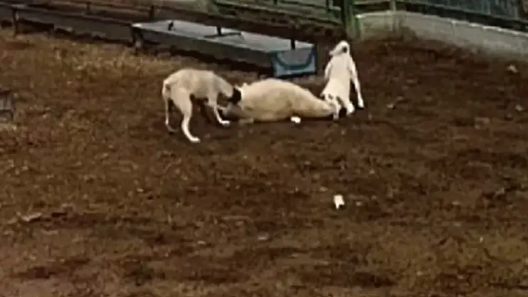 Köpeklerin koyuna saldırısı güvenlik kamerasına anbean yansıdı. Görüntülerde iki kopek yakaladıkları koyunu yere yatırdıkları, koyunun kaçmaya çalıştığı ancak köpeklerin son darbe ile tekrar koyunu yatırıp telef ettikleri görülüyor.