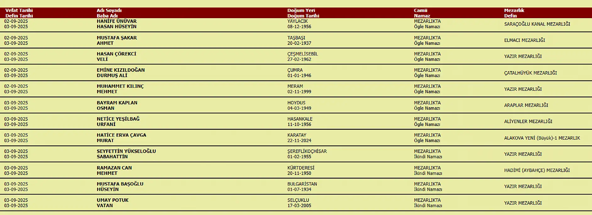 KONYA'DA BUGÜN DEFNEDİLECEK VATANDAŞLAR (03.09.2025)