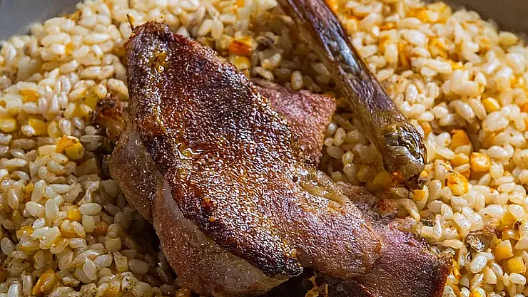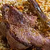 Tencerede kalan et suyuyla pirinç ya da bulgur pilavı hazırlanır. Kızaran et pilavın üzerine yerleştirilerek servis edilir.