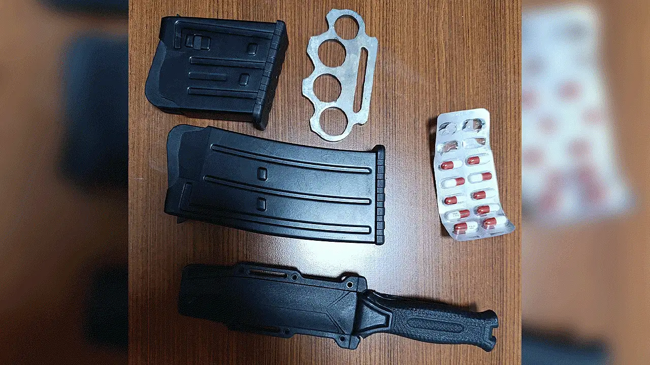 Yapılan aramalarda 2 tüfek şarjörü, 1 kasatura, 1 muşta ve 10 adet uyuşturucu hap ele geçirildi.