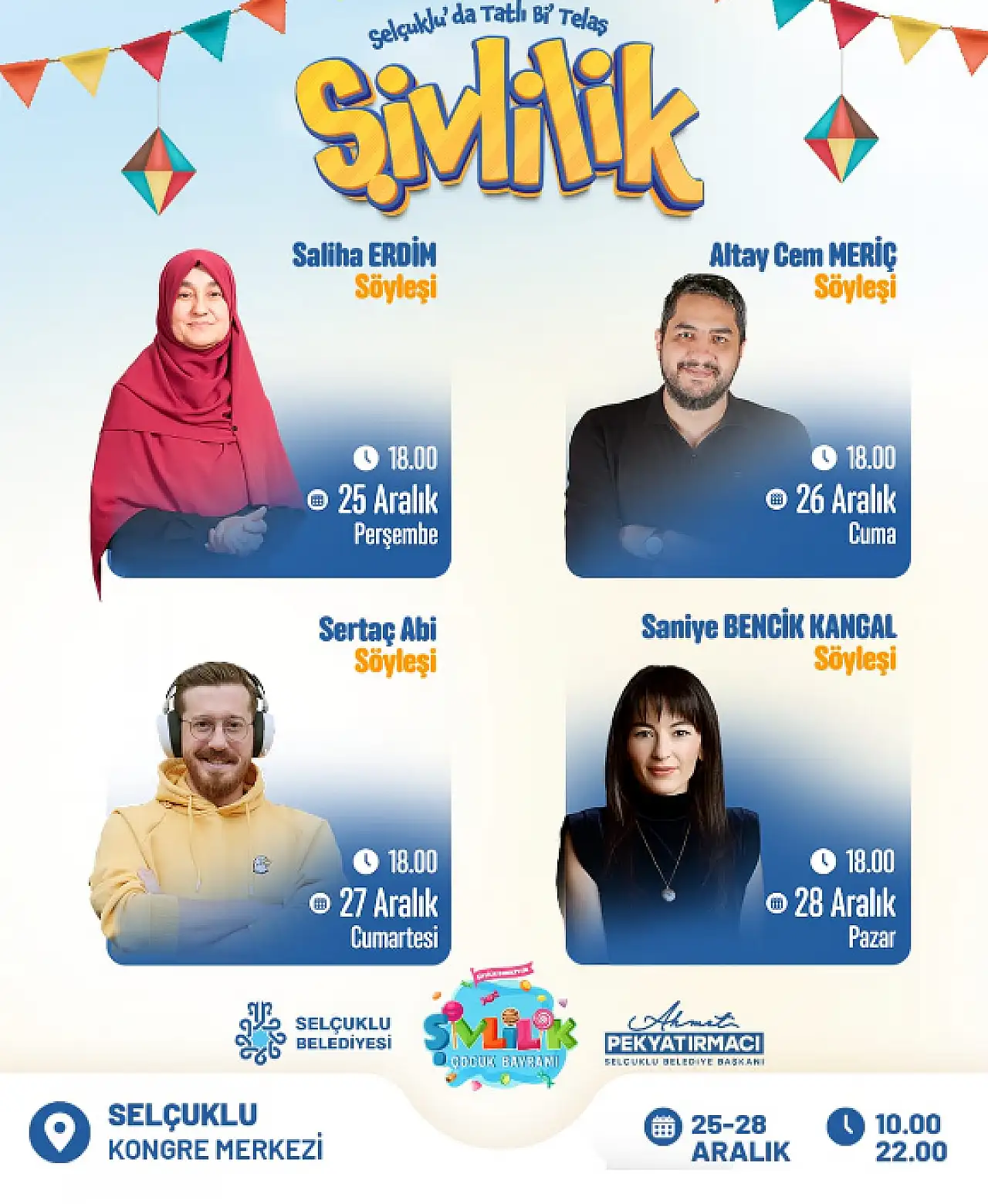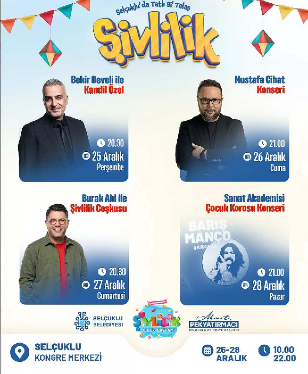 Bu yüzden onların mutluluğu her zaman bizim önceliğimiz olacaktır. Bu yıl da yine çocuklarımız için eğlenceli bir şivlilik programı hazırladık. 25-28 Aralık tarihleri arasında Selçuklu Kongre Merkezimizde gerçekleştireceğimiz Şivlilik Çocuk Bayramı’nda çocuklarımız doyasıya eğlenecek. Tüm çocuklarımızı ve ailelerimizi bu coşkuya ortak olmaya, Şivlilik Çocuk Bayramı’na davet ediyorum” dedi.